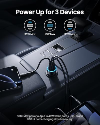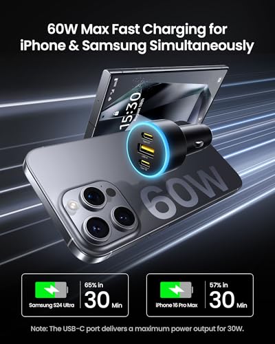 PISEN 60W 3-Port USB C Car Charger – PD30W & QC3.0 Fast Charging, Multi Device Compatible, LED Indicator, Durable Design, Safety Certified for iPhone 16/15/14/13/12 Series