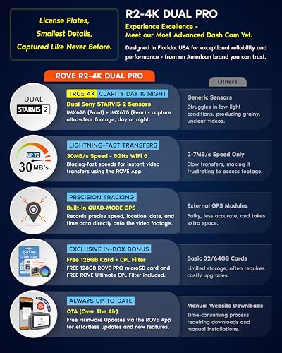 FREE 128GB ROVE PRO microSD CARD & CPL FILTER – Included in the box is a high-performance 128GB ROVE PRO microSD card, tested and optimized for reliable 4K recording without frame drops. Also comes with a ROVE Ultimate CPL filter to reduce windshield glare and reflections for clearer footage. Supports up to 1TB microSD cards for long, uninterrupted recordings—so you’re always ready to capture the road ahead.